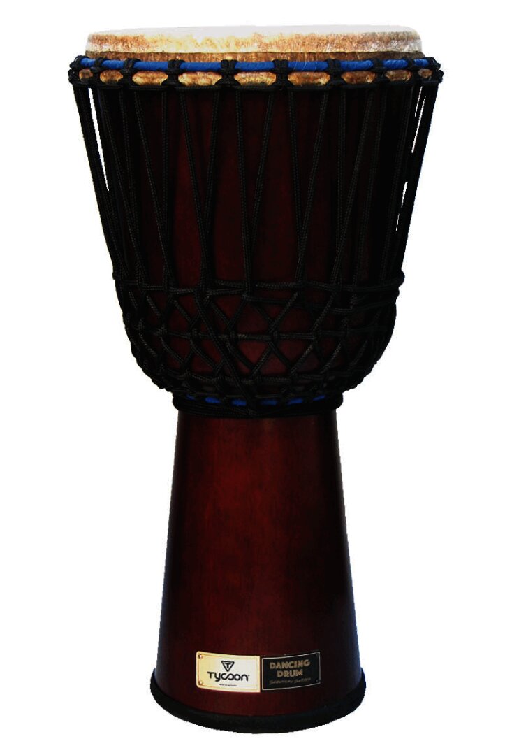 A perfect balance of size, weight, and powerful sound, this djembe is a real “firecracker.” The body is 24-1/2″ tall, constructed of hand-selected environmentally-friendly Siam oak wood, with a 11″ diameter premium natural goat skin head. The traditional shell shape provides the most authentic African sound, with excellent bass tones and sharp slap sounds. The 5mm extra strong non-stretch rope allows for easy and long-lasting tuning.