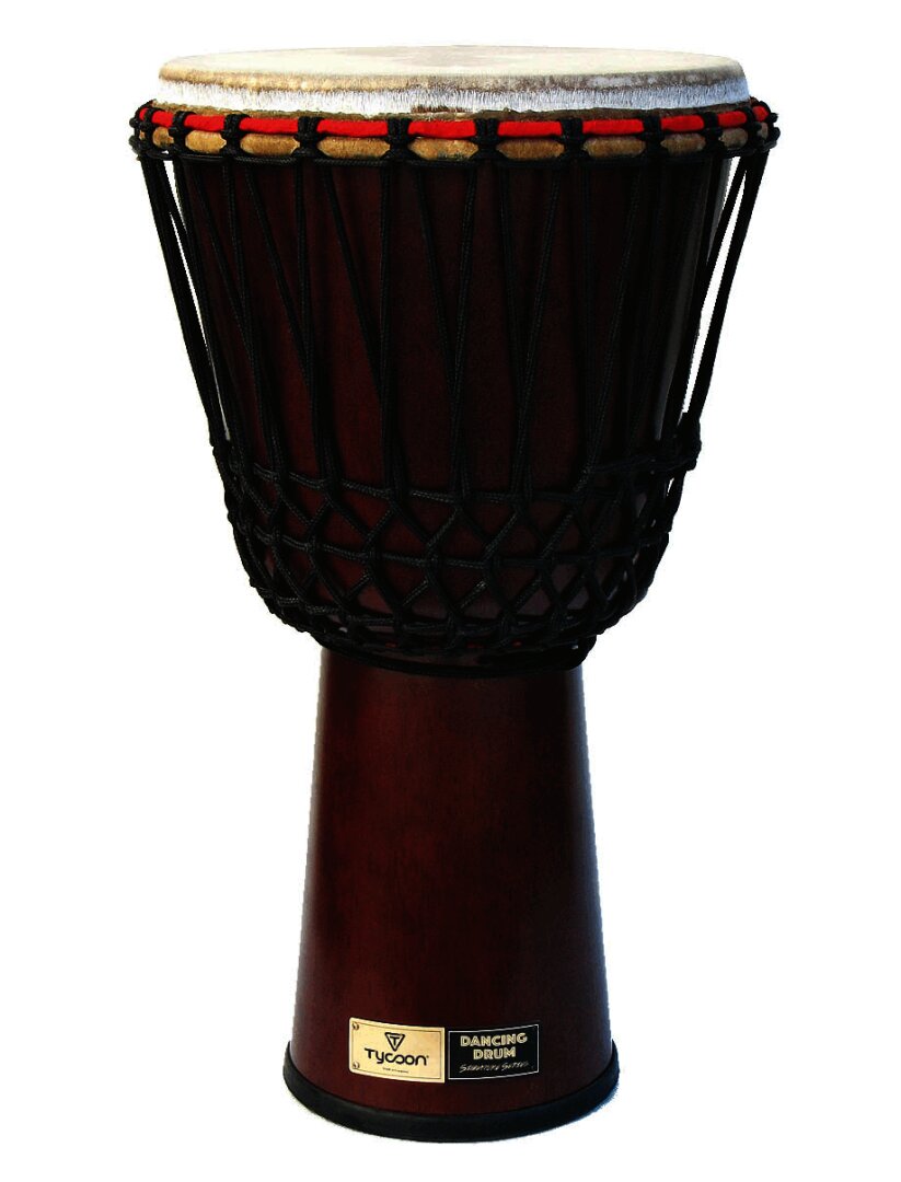 Constructed of environmentally-friendly Siam oak wood, this djembe's body is 24-1/2″ tall, a 13″ diameter premium natural goat skin head. The traditional shell shape provides the most authentic African sound. The deeper bowl and larger head diameter gives a deep, rich bass tone, and a thick slap sound. The 5mm extra strong non-stretch rope allows for easy and long-lasting tuning.